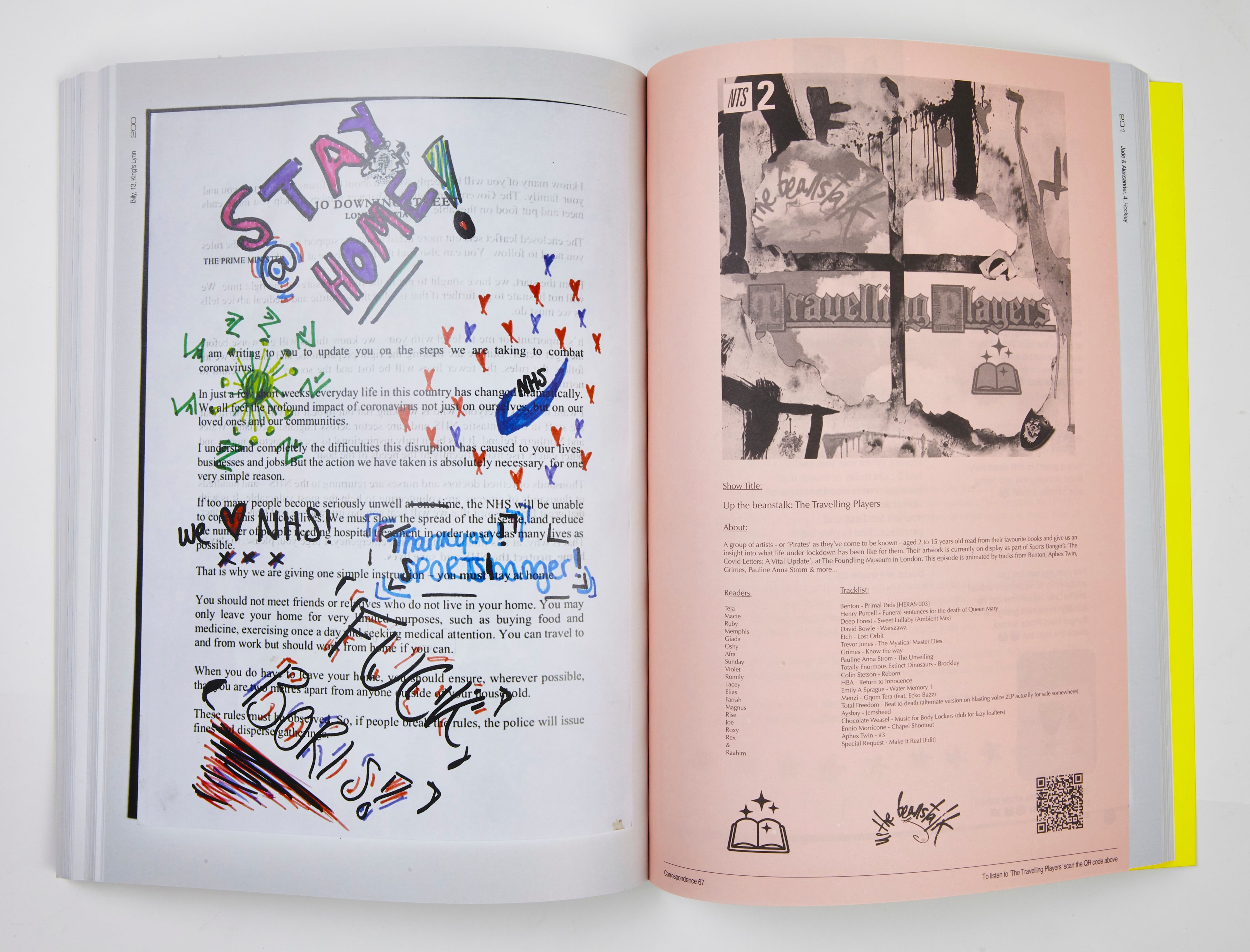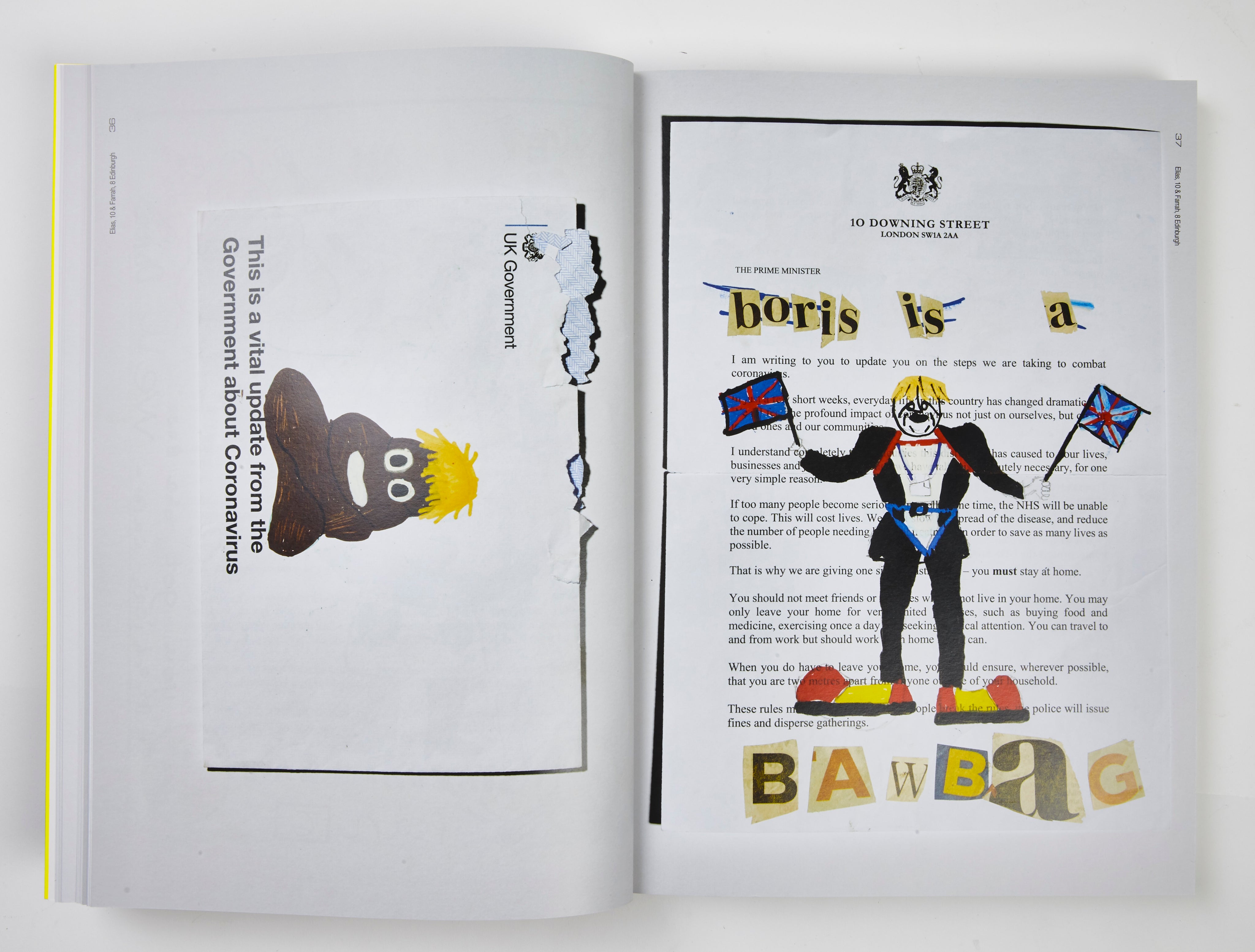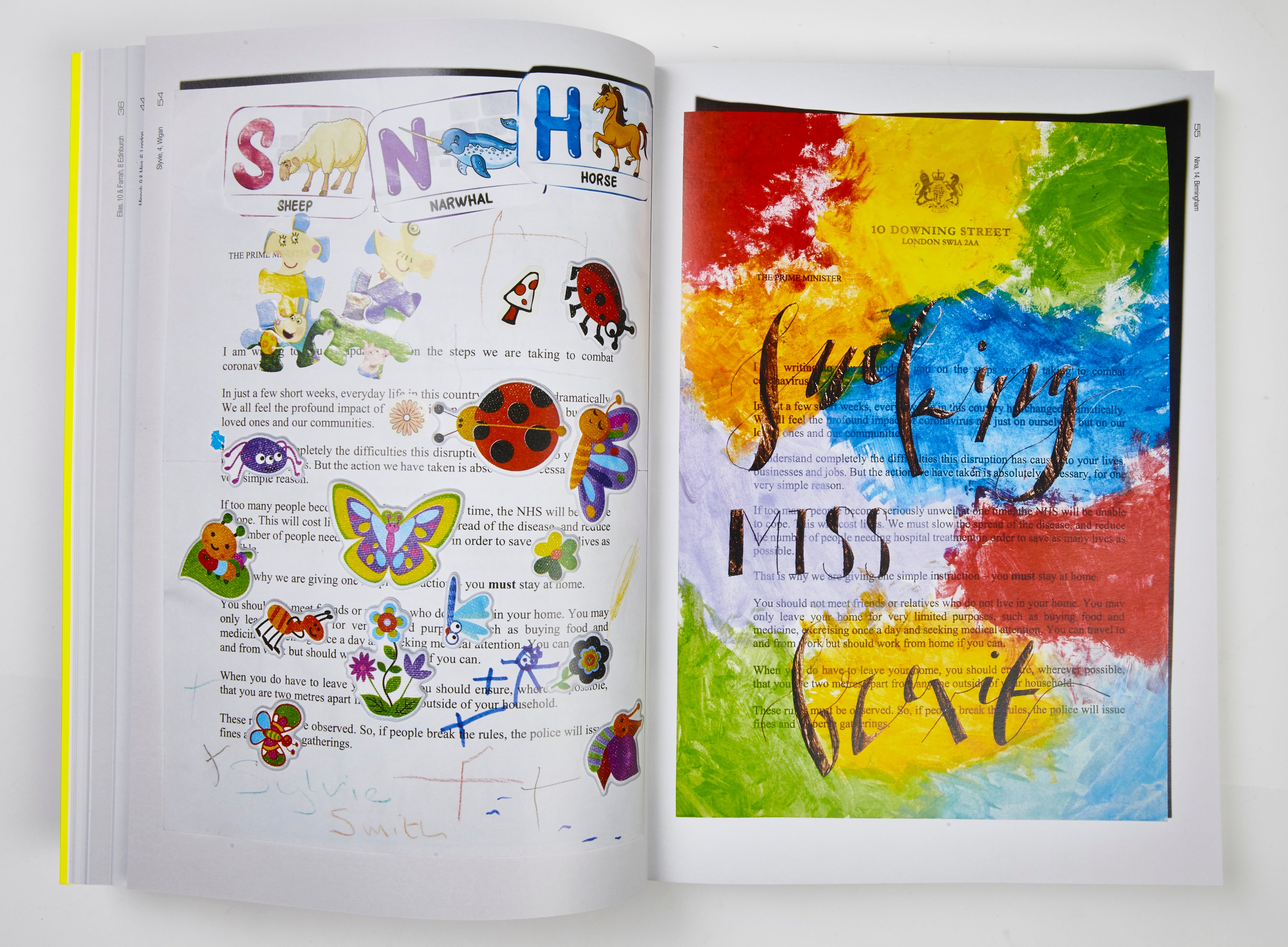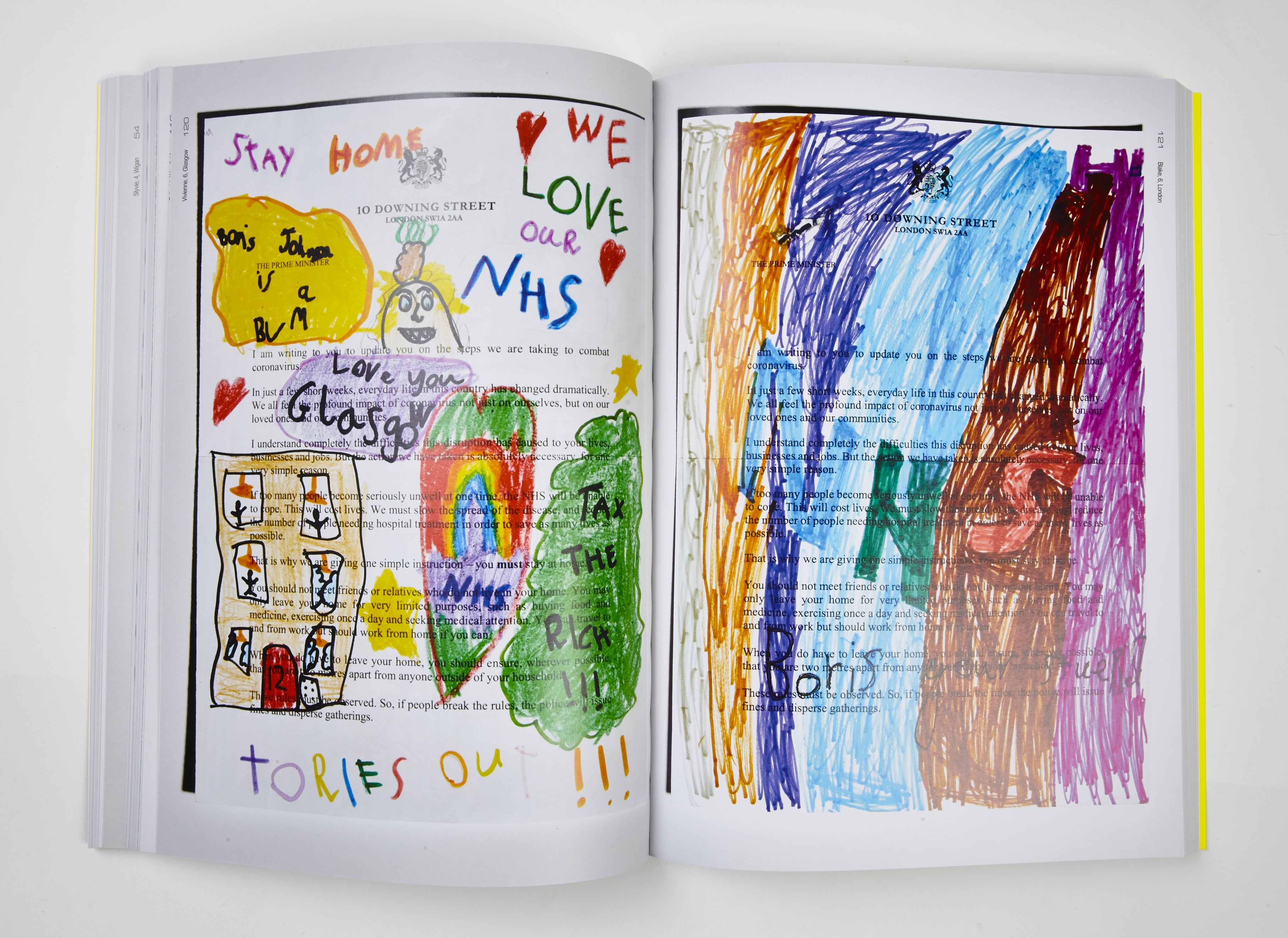 In this 2020 project, Jonny Banger invited over 250 children from across the UK and beyond to express their artistic takes on society, healthcare, and crooked government by defacing an official Covid-19 letter.